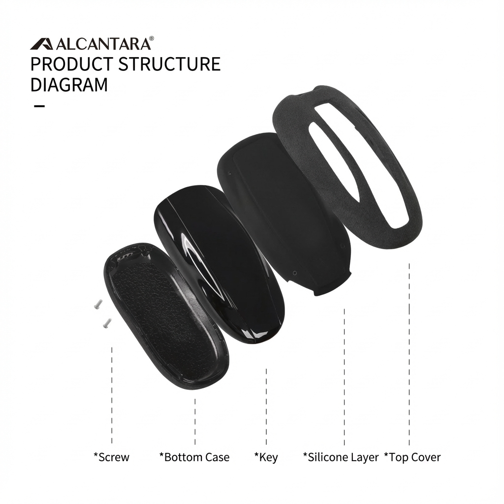 The key cover features a premium Alcantara top for a sophisticated grip, backed by a shock-absorbent silicone core for 360° impact protection.  The assembly is anchored by a reinforced bottom case and locked with precision screws, ensuring a rugged, mechanical fit that keeps your key secure and stylish in any condition.