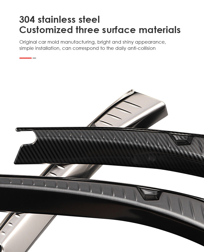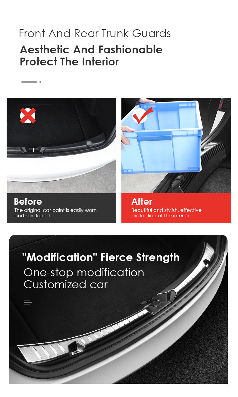 Esta tira antiarañazos del maletero Tesla Model 3 está hecha de acero inoxidable de alta calidad, que es resistente al impacto y la alta temperatura no es fácil de deformar y tiene una larga vida útil. Puede proteger eficazmente las piezas originales del automóvil de ser pisoteadas. El guardabarros interior del maletero Tesla modelo 3 es hermoso, suave, sólido, no es fácil de romper y súper duradero, lo que puede proteger eficazmente las piezas originales del automóvil. El diseño innovador rompe el estándar original y dota a su coche de personalidad y una experiencia visual más avanzada.