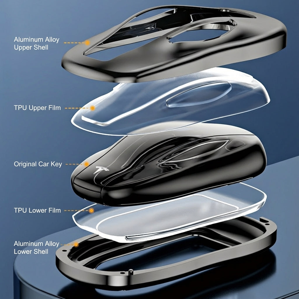 Experience the best of both worlds—rugged durability and soft touch. The outer frame is crafted from aviation-grade aluminum alloy to resist hard impacts and scratches, while the inner TPU shell cushions your key, preventing shock damage and ensuring a snug, rattle-free fit.