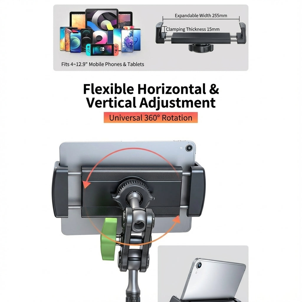 Engineered for versatility, the adjustable clamp spans from 11.6cm to 24.5cm. Whether you are using a compact smartphone or a full-sized tablet, this mount secures them all.